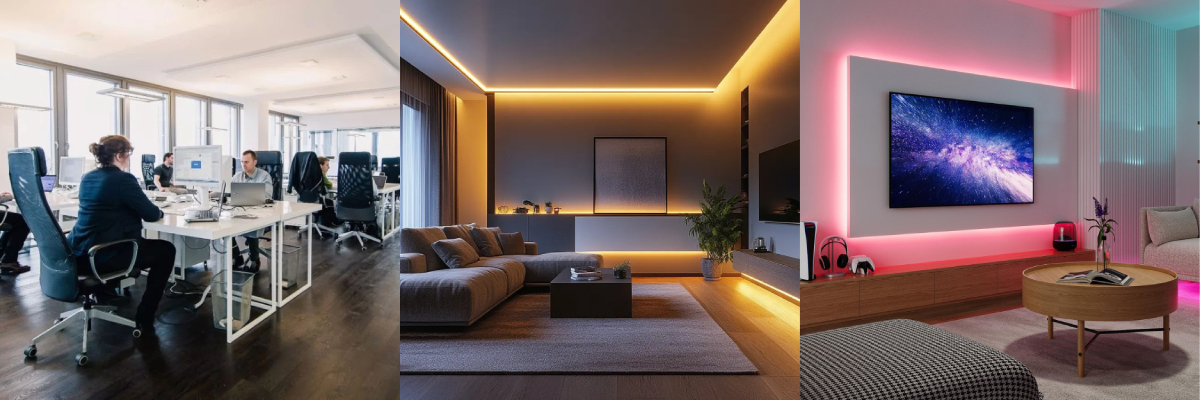Podle prostředí lze světlo přizpůsobit. V kanceláři nebo pracovně zvolit jasnější a chladnější variantu, v obýváku nebo ložnici tlumenější a teplejší. Herní či kreativní prostory mohou využít variabilitu barev a efektů pro stimulaci či atmosféru. Ale i tam je dobré respektovat rytmus očí a mozku.