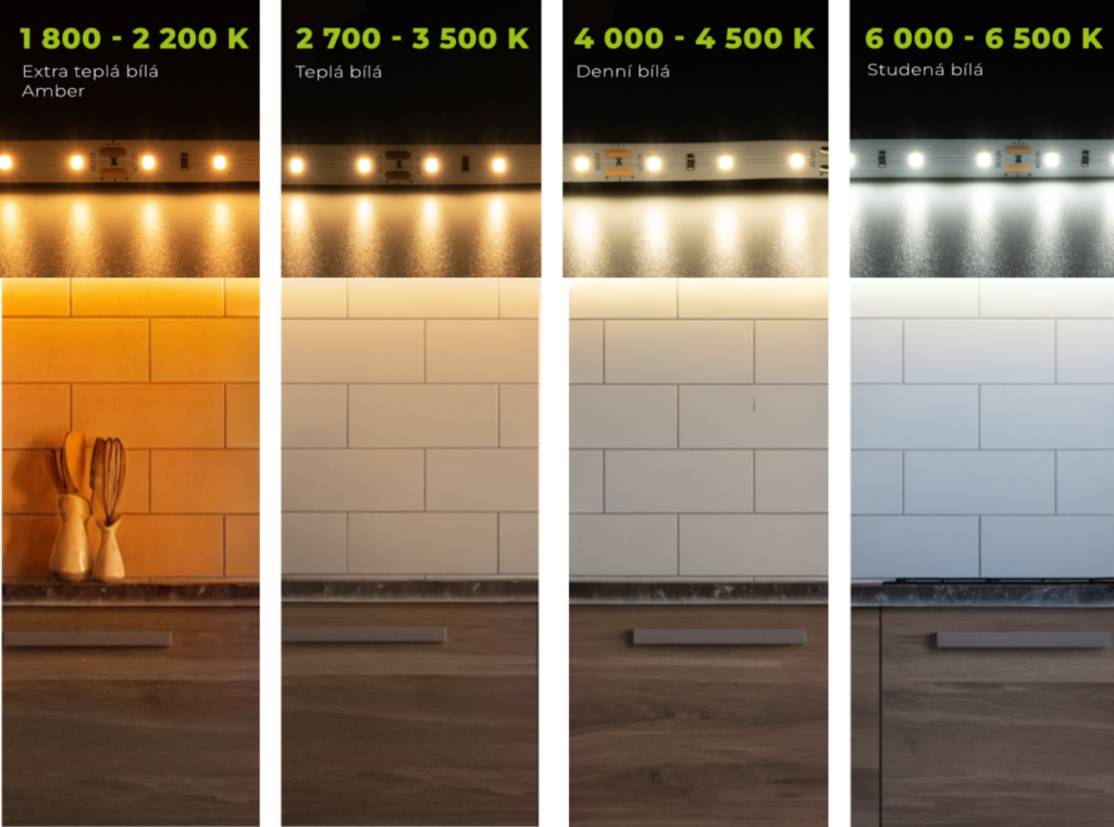• Denní světlo (4000-5500 K) je univerzální. Působí přirozeně, je vyvážené a nedráždí, hodí se pro běžné denní aktivity a všestranné využití. Ráno a večer teplejší, v poledne chladnější.