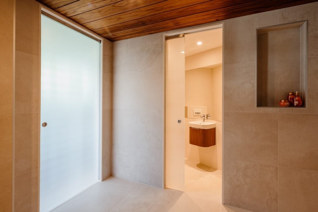 Obrázek: Posuvné dveře se skrytou zárubní v koupelně – praktické řešení, které šetří místo a zachovává čistý vzhled. Zdroj: eclisse.cz