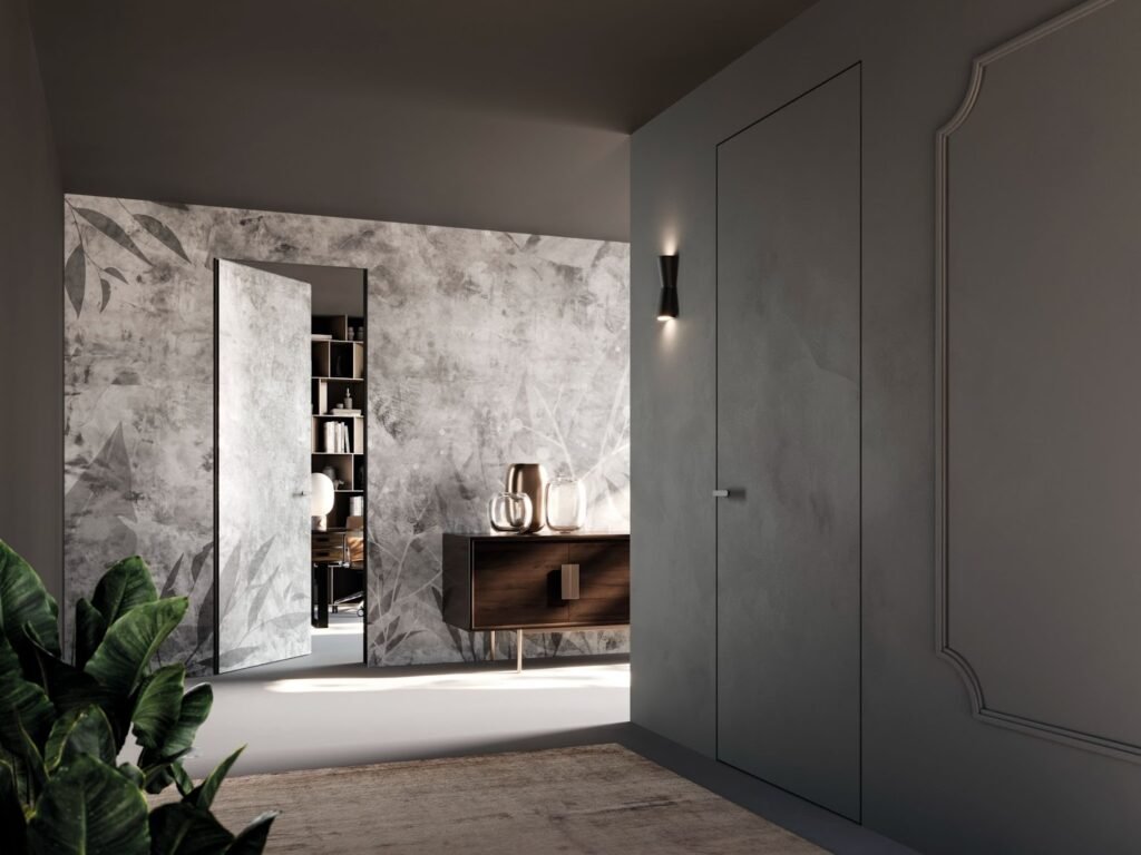 Obrázek: Skrytá zárubeň ECLISSE Syntesis Battente v interiéru s dekorativní tapetou – jedny otevřené, druhé zavřené a téměř neviditelné. Zdroj: eclisse.cz