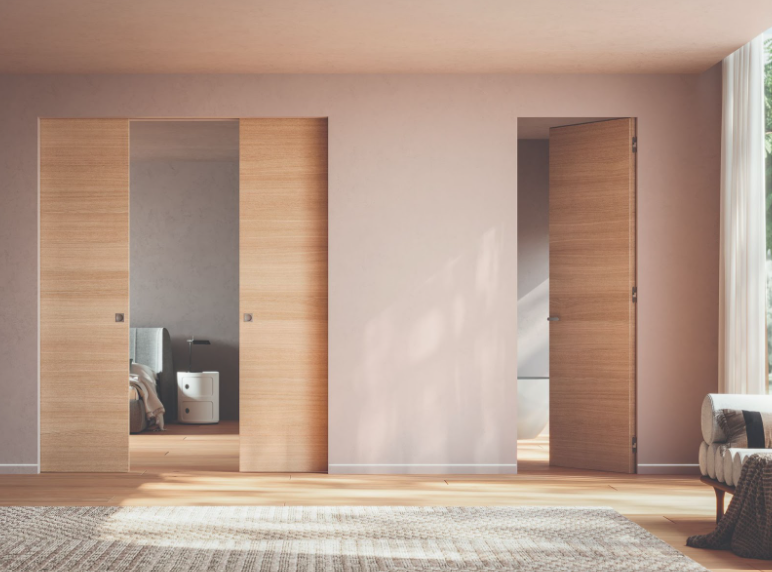 Obrázek: Posuvné dveře do pouzdra i otočné dveře ve skryté zárubni vedle sebe – oba typy vypadají jednotně díky stejné povrchové úpravě. Zdroj: eclisse.cz